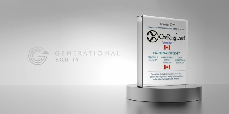 Generational Group, a leading mergers and acquisitions advisor for privately held businesses, is pleased to announce the sale of its client, The Ring Lord, to Grant Philip, 905889 Ontario Limited, and Edica Properties, Inc. The acquisition closed December 31, 2019 and details were not disclosed.